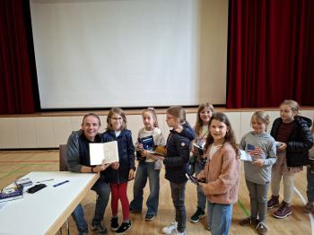Nach den Lesungen wurden viele Fragen der Kinder beantwortet. Im Anschluss verteilte er Autogrammkarten und die Kinder konnten die vorgestellten Bücher erwerben. Natürlich wurden auch diese vom Autor signiert. So nahm jedes Kind eine besondere Erinnerung mit nach Hause. Alle vorgestellten Bücher stehen für die Kinder auch als Ausleihexemplare in der Schulbibliothek bereit.