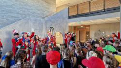 Nach der offiziellen Begrüßung wurde in der Schule ausgelassen gefeiert. Eine große Polonaise zog durch das gesamte Schulhaus und die Aula wurde in einen riesigen Tanzpalast verwandelt. Die Karnevalsfeier war ein voller Erfolg und wird den Kindern sicherlich noch lange in Erinnerung bleiben.