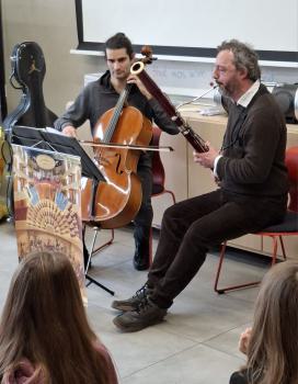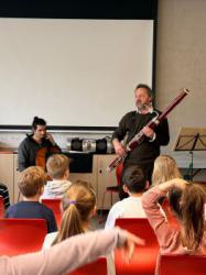 Mit im Gepäck hatten Nikolaus Maler (Fagott) und Yoël Cantori (Cello) ihre Instrumente – und jede Menge Geschichten rund um die Welt der Musik. Zunächst stand für die Klassen 2a und 2b die „Musikalische Märchenstunde“ auf dem Programm. Erzählt wurde die Geschichte „Der Lindwurm und der Schmetterling“ von Michael Ende.